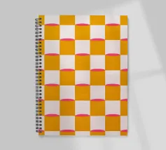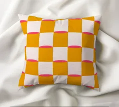 Questo vivace quadro astratto combina un motivo a scacchiera in giallo senape, rosa e bianco con forme geometriche per creare un'atmosfera creativa e moderna. I colori vivaci e gli elementi minimalisti rendono quest'opera d'arte di grande effetto in qualsiasi stanza.