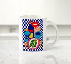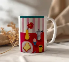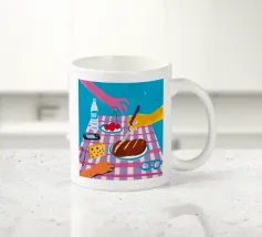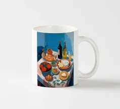 Una nostalgica natura morta con una radio in stile vintage, un piatto di pane e formaggio su un panno di percalle, una tazza di caffè e una bottiglia di vino. La scena evoca un'atmosfera accogliente e retrò, perfetta per una cucina o una sala da pranzo.