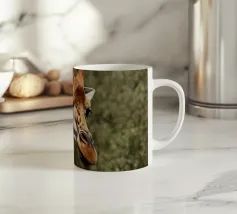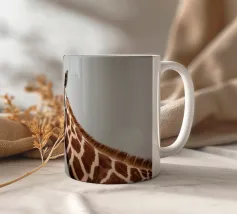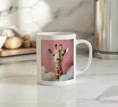 Una giraffa si staglia in primo piano, ornata da motivi vivaci e colorati. Lo sfondo è una sfumatura liscia, che esalta l'aspetto unico della giraffa in un ambiente vivace.