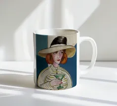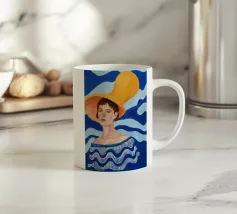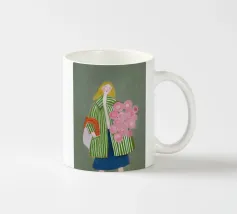 Illustrazione di una donna che tiene un ombrello rosso e indossa un abito colorato a righe arcobaleno. La composizione è una rappresentazione chic, elegante e leggermente malinconica della ricerca del colore in una giornata grigia.