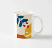 Un'illustrazione semplice ed elegante di un ramo con foglie blu e bacche rosse su uno sfondo di forme astratte dai colori caldi. Il design minimalista ha un'estetica moderna di ispirazione giapponese.