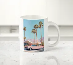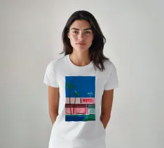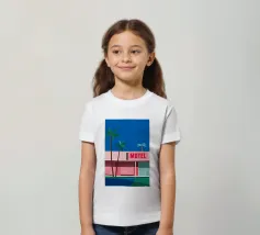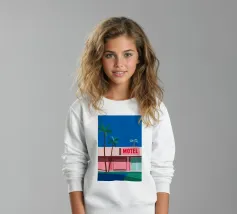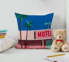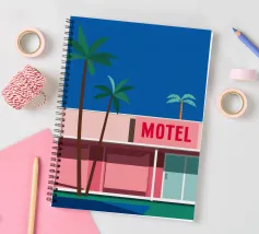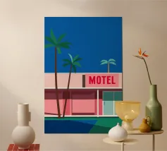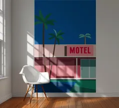 Una classica insegna retrò "MOTEL" risplende contro un cielo serale blu intenso, affiancata da palme in primo piano. L'immagine cattura un'atmosfera nostalgica e cinematografica che ricorda un classico viaggio americano in macchina.