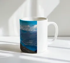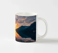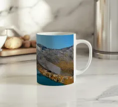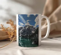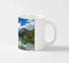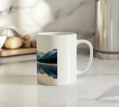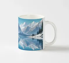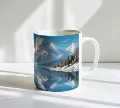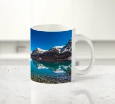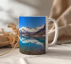 Un cielo azzurro e limpido si riflette perfettamente in un lago sereno circondato da maestose montagne innevate. Questa splendida scena cattura l'essenza della bellezza e della tranquillità della natura.