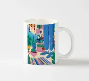 Un'illustrazione di una stanza vivace e in stile bohémien è assolutamente piena di una collezione di piante in vaso e cactus su un tappeto a righe colorate, creando un rifugio perfetto per un amante delle piante.