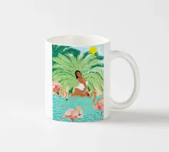 Una donna riposa vicino a una cascata in un vivace ambiente tropicale. Le palme, i fiori radiosi e il tramonto luminoso creano un santuario mozzafiato.