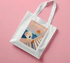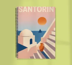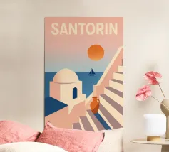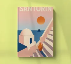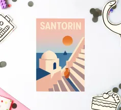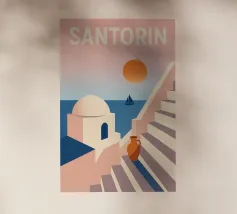 Immergetevi nella magia di Santorini con questo poster minimalista e poetico. Cupole bianche, scale inondate di luce, il Mar Egeo e il tramonto creano uno scenario di totale evasione. Lo stile grafico raffinato e i toni pastello evocano le vacanze, la calma e l'eterna bellezza delle isole greche. Appendetelo e fuggite semplicemente guardandolo.