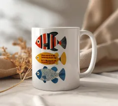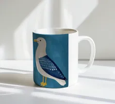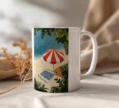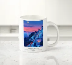 L'immagine mostra un idilliaco paesaggio costiero con case imbiancate a calce, porte e finestre blu e tetti color arancio, che si adagiano come terrazze su una scogliera rocciosa. Sullo sfondo svetta un mulino a vento, mentre il mare blu intenso luccica sotto un cielo limpido. Una vegetazione rigogliosa e fiori colorati costeggiano i sentieri. Lo stile è pittoresco e romantico, ispirato all'architettura mediterranea - in particolare all'isola greca di Santorini - e trasmette tranquillità, calore e bellezza senza tempo.