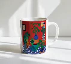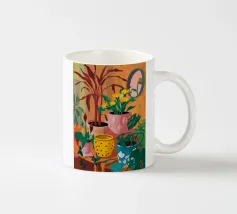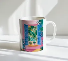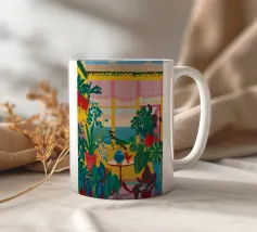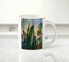 Una bella illustrazione di uno scaffale pieno di piante d'appartamento verdi e rigogliose, immerso nella calda luce del sole. La scena è un tributo sereno e gioioso alla bellezza di un giardino interno.