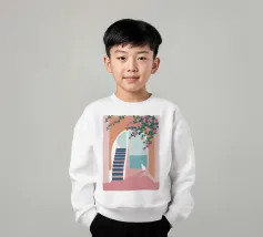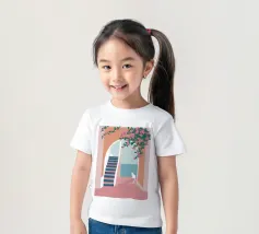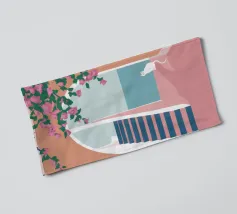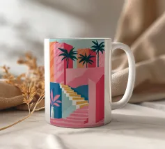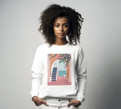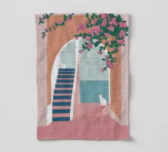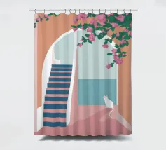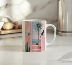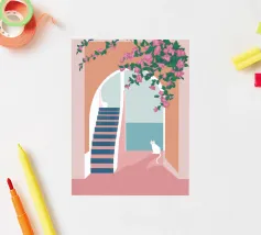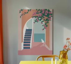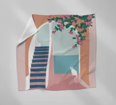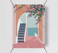 Un gatto bianco siede pacificamente sul pianerottolo di una scala esterna di un edificio dalle pareti rosa. La scena, con le sue linee pulite e gli archi, è un'istantanea architettonica serena, minimalista e affascinante.