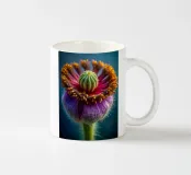 Una ripresa macro cattura i dettagli intricati di un fiore di papavero. Il fiore presenta petali viola, un centro rosso e un pistillo verde. Gli stami arancioni circondano il centro. Lo sfondo è di un blu scuro sfocato. L'immagine mette in evidenza le trame delicate e i colori vivaci del fiore.
