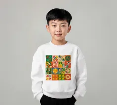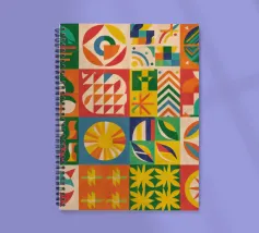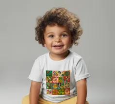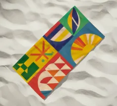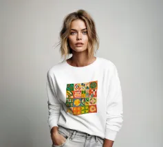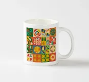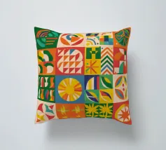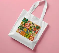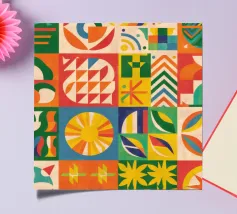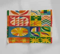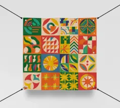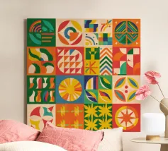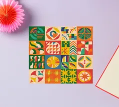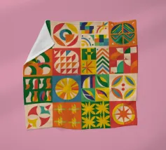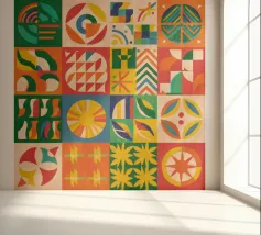 Un motivo vivace e intricato che ricorda una trapunta, composto da vari quadrati con simboli e disegni geometrici ispirati all'arte popolare. La ricca tavolozza di colori crea un'atmosfera calda e artigianale.