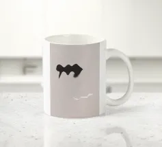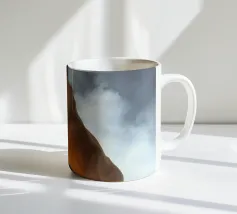 Una rappresentazione monocromatica presenta una forma accartocciata che ricorda in qualche modo una montagna o una formazione rocciosa. Le ombre e le lumeggiature sono state utilizzate per dare alla forma un aspetto tridimensionale, e poggia su uno sfondo più scuro che ne esalta la silhouette.