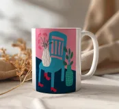 Un'affascinante ed eccentrica natura morta con una pianta in vaso appoggiata su una sedia blu brillante. La composizione è semplice ma piena di carattere, con colori vivaci e uno stile giocoso.