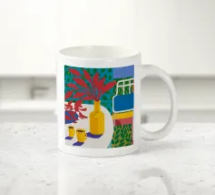 Una scena d'interni con una poltrona vuota rivestita con un motivo chintz floreale, riflessa in un grande specchio. La stanza è dipinta nei toni del rosa e del rosso, creando un'atmosfera calda, accogliente e leggermente nostalgica.
