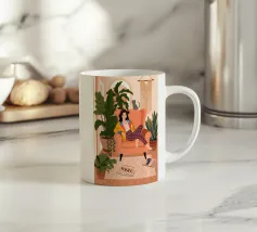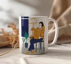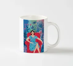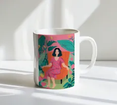 Questa opera d'arte raffigura una persona seduta in una stanza colorata che indossa abiti a righe. Lo sfondo comprende varie piante e mobili, creando un ambiente accogliente e sereno.