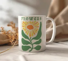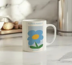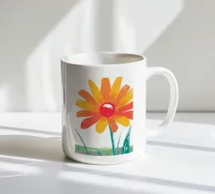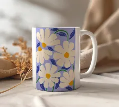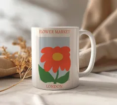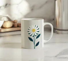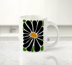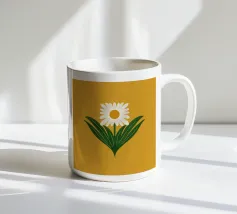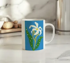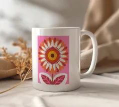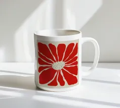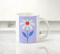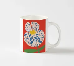 Un'illustrazione audace e grafica di un singolo grande fiore, probabilmente un anemone, con petali a strisce bianche e blu e un centro giallo. Lo sfondo rosso brillante rende il fiore il fulcro assoluto di questo pezzo potente.