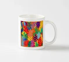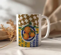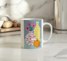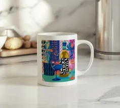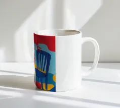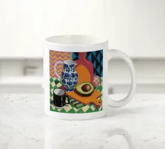 Una natura morta astratta e altamente stilizzata che presenta una bevanda in un bicchiere di vimini con una cannuccia blu. La scena è ambientata su una superficie con audaci motivi rossi e gialli, su uno sfondo verde strutturato.