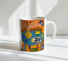 Una natura morta astratta e altamente stilizzata che presenta una bevanda in un bicchiere di vimini con una cannuccia blu. La scena è ambientata su una superficie con audaci motivi rossi e gialli, su uno sfondo verde strutturato.