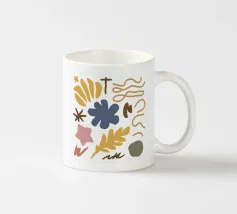 Una composizione astratta giocosa, ispirata a Maraoui, di forme organiche colorate, tra cui foglie, un sole e altre forme, che fluttuano su uno sfondo neutro.