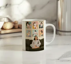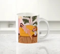 Un momento di riflessione in una stanza vestita di rosa tenue e verde giungla. Siede nell'immobilità, avvolta nella seta a righe e nel silenzio domenicale, circondata dal conforto di fiori audaci e luci soffuse.