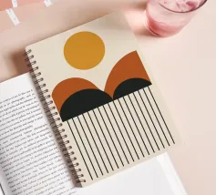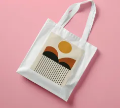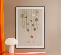 Un sole stilizzato sorge su colline arrotondate, mentre linee verticali cadono come pioggia soffice: una meditazione grafica sull'equilibrio e sugli inizi. Questo pezzo astratto di ispirazione Bauhaus invita alla calma e al ritmo nello spazio che abita.