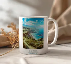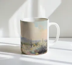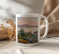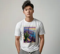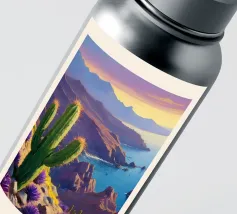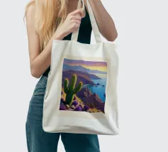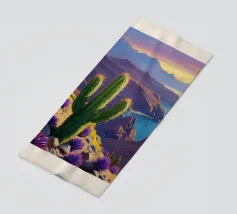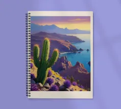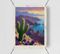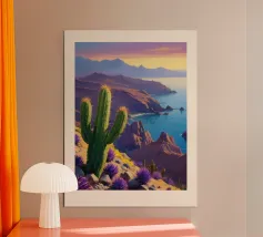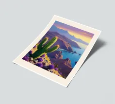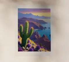 Un'illustrazione paesaggistica vivida e suggestiva di un deserto pieno di cactus che si affaccia su una drammatica vista costiera al tramonto. Le scogliere dorate e le piante di agave dai toni violacei contrastano splendidamente con l'oceano turchese e il cielo luminoso. Quest'opera d'arte cattura la bellezza selvaggia dei paesaggi aridi che incontrano il mare, perfetta per gli amanti della Baja California, dell'Arizona o delle vibrazioni del deserto mediterraneo. Una stampa murale di grande effetto per interni boho, per gli amanti della natura o per l'arredamento di una casa al mare.