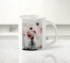 Questa illustrazione minimalista mostra un'elegante tazza di ceramica a righe bianche e nere, circondata da fiori rosa e foglie verdi. Sullo sfondo beige, l'allegro bouquet di fiori irradia leggerezza estiva e porta la freschezza botanica in ogni stanza!