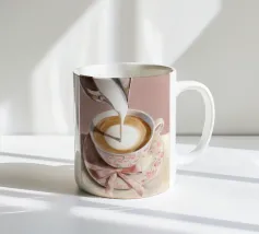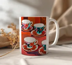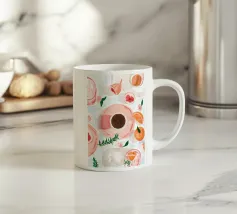 Questa vivace illustrazione combina caffè, fiori e frutta in una tavolozza di colori vivaci ed estivi. Con colori pastello tenui e un cucchiaio dorato, il motivo dell'immagine conferisce un'atmosfera allegra a qualsiasi casa, perfetta per gli amanti del caffè e della natura.