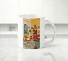 tazze da caffè finestra luce solare scaffali piante libri sedia pavimento in legno finestra aperta tende set da tè pianta in vaso quaderni stanza illuminata dal sole arte da parete atmosfera accogliente tazza di tè mobili in legno pavimento laminato sole