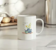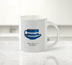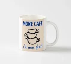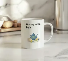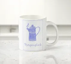 Diverse tazze di caffè sono giocosamente impilate l'una dentro l'altra e formano un motivo armonioso e minimalista. Compare anche la scritta svedese "en kopp kaffe, tack" ("una tazza di caffè, per favore"). La combinazione è calda, invitante e tipicamente scandinava.