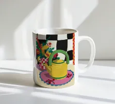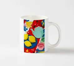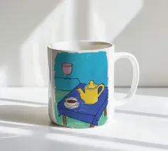 Una natura morta calma e composta di una teiera verde e blu e di una tazza rosa appoggiate su un panno a righe bianche e blu. I limoni a fette aggiungono un tocco di freschezza a questa serena e invitante scena dell'ora del tè.