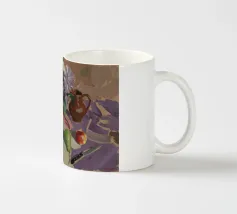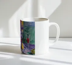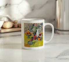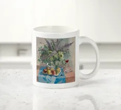 Composizione di natura morta con una teiera d'argento, una tazza da tè, una ciotola di frutta (mele, uva) e un bicchiere di vino rosso su una tovaglia bianca. Lo sfondo è di un fresco blu-verde. Lo stile enfatizza la forma e il riflesso.