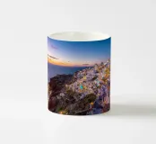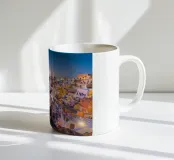 I tetti luminosi e le facciate bianche si affacciano sulla caldera, mentre Oia si apre su un'ampia distesa di Egeo. Ringhiere e sentieri tracciano dolci linee lungo la scogliera, bilanciando l'architettura pulita con il blu intenso dell'acqua. Una vista chiara e ariosa fatta di luce, forme e orizzonte calmo.