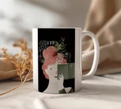 Donna con la mente in fiamme per il fantastico libro che sta leggendo - a proposito di avere una mente aperta! Ragazza retrò, globo terrestre, mela e mazzo di fiori sul tavolo. Vibrazioni da studente universitario vintage. Surreale e divertente collage originale di MsGonzalez.