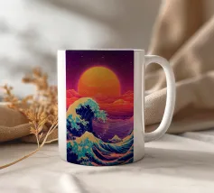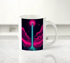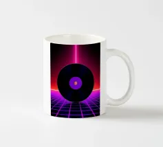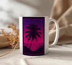 Questo motivo mostra una scena suggestiva in stile retrofuturistico: un enorme sole al tramonto colora il cielo di forti tonalità di giallo e magenta mentre sprofonda dietro una scura catena montuosa. In primo piano corre un pavimento luminoso a griglia che crea una prospettiva in profondità e termina in un corso d'acqua riflettente. Palme tropicali incorniciano l'immagine a sinistra e a destra. Lo stile visivo ricorda l'estetica synthwave e combina elementi naturali con immagini digitali.