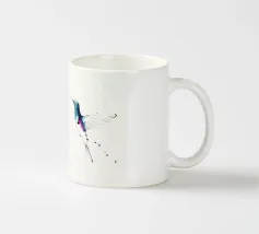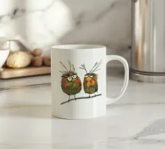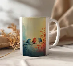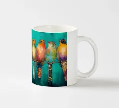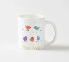 Disegno a inchiostro colorato di tre uccelli viola seduti uno accanto all'altro su un filo. Ognuno di loro è impegnato nelle proprie cose. Il viola è macchiato e spontaneo