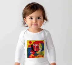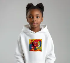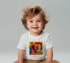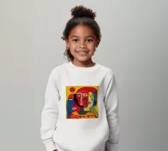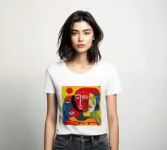 Un ritratto astratto potente e crudo di tre volti, reso con colori primari audaci di rosso e blu e contorni neri, che trasmettono un'energia primordiale e cubista.