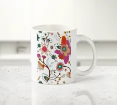 Questo disegno vi trasporta in un mondo allegro e intricato di fiori e uccelli, pieno di colori e di leggerezza. Numerosi fiori stilizzati e foglie delicate in tonalità vivaci danzano sullo sfondo e trasmettono una sensazione di umore estivo, gioia di vivere e bellezza spensierata.