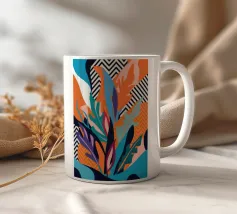 Illustrazione stravagante e surreale di una testa di uccello blu su un corpo che indossa una camicia a righe bianche e nere (una camicia bretone), su uno sfondo astratto.