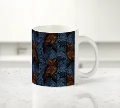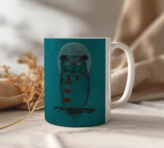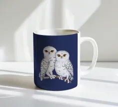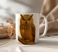 Un dipinto a olio di un gufo dall'aspetto simpatico e divertente. Si tratta di un uccello marrone chiaro con grandi occhi arancioni. Gli occhi del gufo sono un po' irregolari, il che lo fa sembrare ancora più buffo e dolce. Sembra anche un po' spaventato con i suoi occhi rotondi.