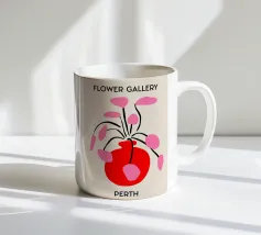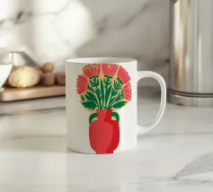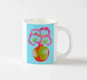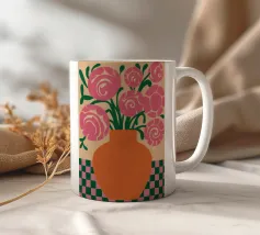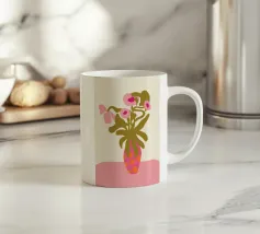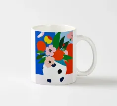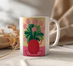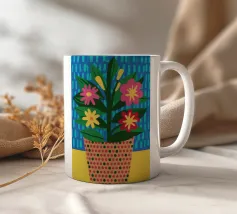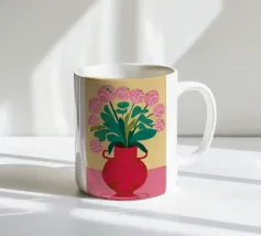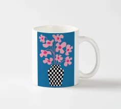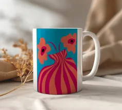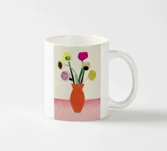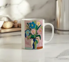 Questa colorata illustrazione grafica mostra un grande bouquet di fiori in un vaso, che delizia con elementi giocosi disegnati a mano in rosa, azzurro e verde. Il design minimalista e astratto combina motivi botanici con un'estetica pop art. Ideale per una decorazione d'interni vivace.