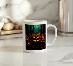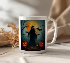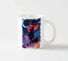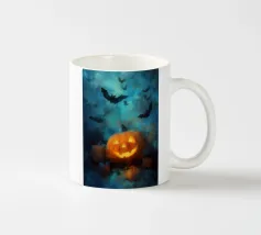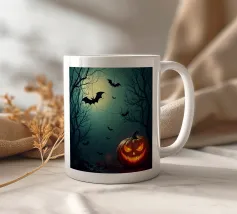 Al calare del crepuscolo, una strega in silhouette vola a cavallo della sua scopa tra i pipistrelli, con una zucca incandescente in primo piano, creando un'atmosfera incantevole.