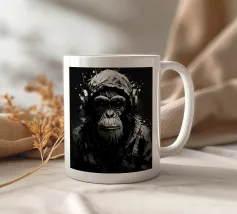 Una rappresentazione umoristica e artistica di uno scimpanzé vestito in smoking con bretelle, che fuma con sicurezza un sigaro, su uno sfondo neutro. L'immagine emana fascino ed eleganza con un tocco eccentrico.