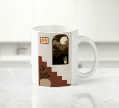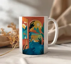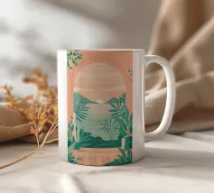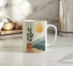 Una composizione minimalista presenta un vaso con una pianta verde davanti a una finestra ad arco, che mostra un paesaggio sereno con montagne, sole e lago in toni tenui. Le calde tonalità del marrone e del rosa creano un'atmosfera naturale e rilassante.