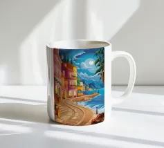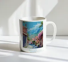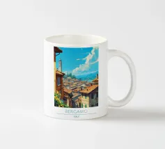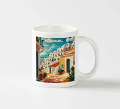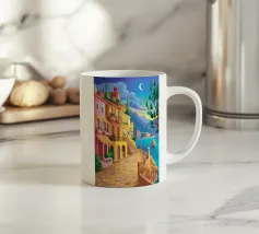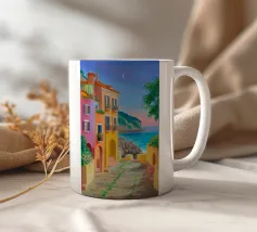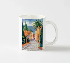 Una veduta prospettica di una strada europea stretta e tortuosa, fiancheggiata da edifici colorati, piante in vaso e diretta verso un cielo luminoso e nuvoloso.