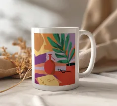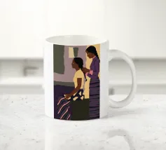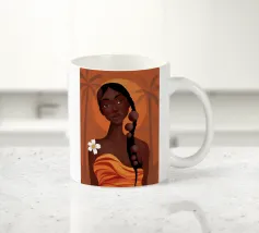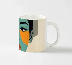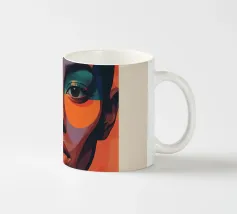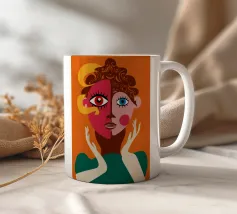 Un suggestivo ritratto astratto di un volto di donna, diviso in due metà, una nera e una bianca, con labbra rosse e capelli fluenti su un caldo sfondo arancione.