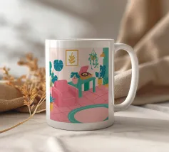 Un'illustrazione vivace di un soggiorno eclettico e massimalista con mobili colorati, una parete a galleria, numerose piante d'appartamento e un tappeto viola.