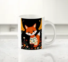 Una volpe illustrativa con uccelli e fiori nella foresta.