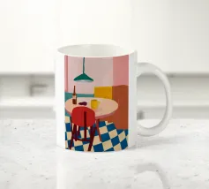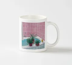 Un'illustrazione umoristica per il bagno degli ospiti: "Siediti, non fare pipì in piedi!". - in colori pastello e design minimalista delle piastrelle, perfetto per un bagno moderno.
