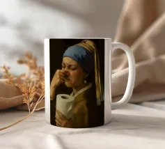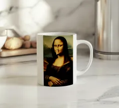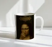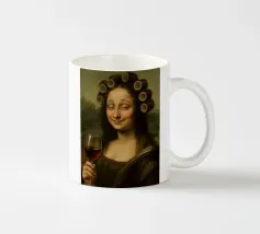 Ritratto in stile old-master della Monna Lisa con una smorfia mentre si stringe il naso tra indice e pollice, con gli occhi stretti come per soffocare un odore sgradevole. Sopra la sua testa, una targa in ottone ornato recita "BAGNO", con la porta del bagno rivestita in legno scuro. Visivamente, questa buffa opera d'arte della Monna Lisa attira l'attenzione sul naso e sulla bocca della donna, trasformando il suo sorriso enigmatico in una reazione inequivocabile.